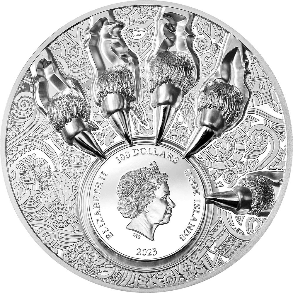 On the reverse of 2023 1 Kilo Cook Islands Silver Coins a lion is depicted in closeup. This design is rendered in ultra-high relief as we see the lion giving a mighty roar. The reverse also contains a more abstract depiction of a lion on the left side of the design.