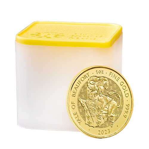 Each 2023 1 oz British Gold Tudor Beasts Yale of Beaufort Coin available here is in Brilliant Uncirculated condition. The 1 oz gold coins in this series are packaged individually in plastic flips. Multiples will arrive in protective tubes of 10 coins or Monster Boxes of 100 coins. The Monster Box holds a total of 10 tubes of 10 coins each.
