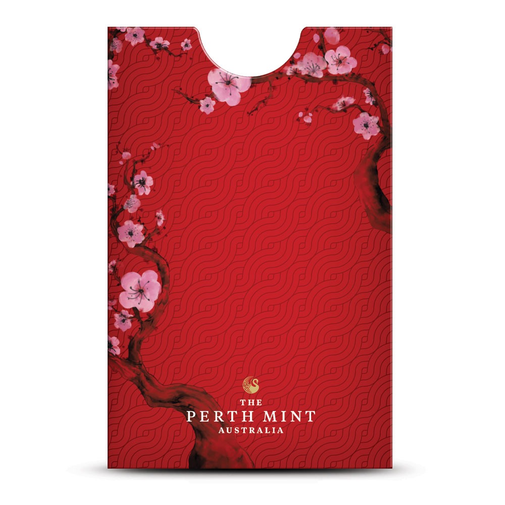 All 1 oz Perth Mint Lunar Year of the Snake Gold Bars are individually packaged in tamper-evident assay cards. The cards feature a red background with plum blossoms across the front. The back of the card includes the authenticating details for each gold bar. Each bar has micro-laser engraved authentication features in the form of letters only visible under magnification.