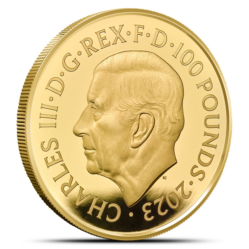 King Charles III is featured on the obverse of all 2023 1 oz Proof Gold Morgan Le Fay Coins. The King is depicted in left-profile relief, facing the opposite direction of his mother, Queen Elizabeth II. Most notably, he’s displayed without a crown. Identifying marks such as the issuing year and denomination surround the portrait.