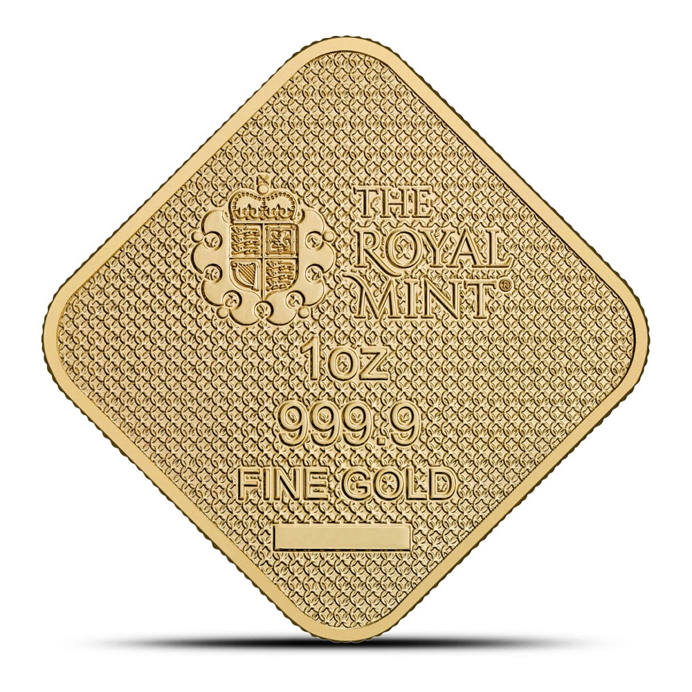 The reverse of the Royal Mint Queen’s Beast Completer Gold Bar features a guilloche-patterned background and prominently displays The Royal Mint’s crest. You’ll also find key specifications inscribed here, including the bar’s weight, purity, and metal content.