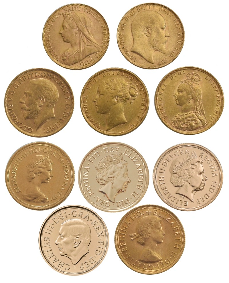 As pictured, these include the Charles III portrait by Martin Jennings, Elizabeth 5th portrait by Jody Clark, Elizabeth II 4th portrait by Ian Rank- Broadley, the Elizabeth II 2nd portrait by Arnold Machin, the Elizabeth II 1st portrait by Mary Gillick, the George V portrait by Bertram Mackennal / George Kruger Gray / Percy Metcalfe, the Edward VII portrait by George William De Saulles, the Victoria Old Head (Thomas Brock), Jubilee Head (Joseph Edgar Boehm) and Young Head (William Wyon).