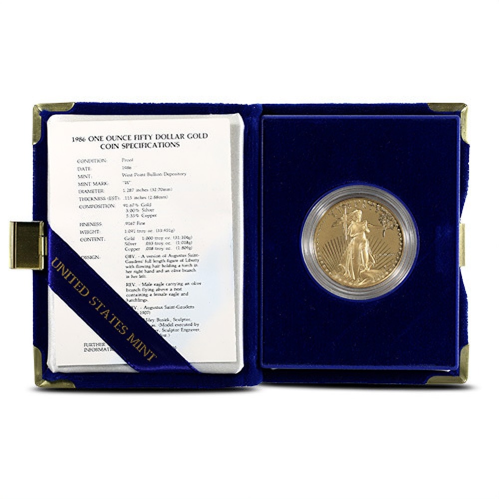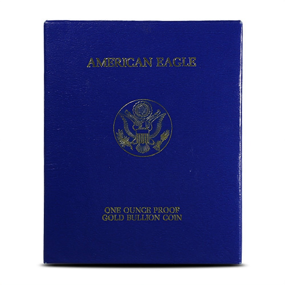 Each of the 1986-W 1 oz Proof American Gold Eagle Coins listed here comes with the original packaging from the United States Mint. Proof Gold Eagles are packaged individually inside display boxes from the US Mint and come with a Certificate of Authenticity. As proof coins, you will notice frosted designs over mirror-like background fields.