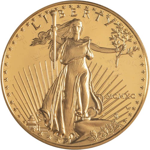 For the obverse field of the 1990 4-Coin Proof American Gold Eagle Set, you will be excited to find the image of Lady Liberty! This design was created by Augustus Saint-Gaudens in 1907. He had been commissioned by President Roosevelt to forge a new design for American gold coinage. He ended up coming up with the depiction of Liberty striding confidently forward into an unknown future with a torch in one hand and an olive branch in the other. The torch represents a beacon of hope and guidance while the olive branch is America’s offering of peace and friendship with others.