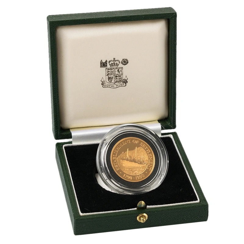 $250 gold proof coin struck by the Royal Mint for the Pitcairn Islands – celebrating 200 years of settlement of the Islands. The coin is the same dimensions and weight as the British £2 double Sovereign. The coin is presented boxed with a certificate.