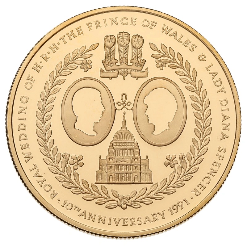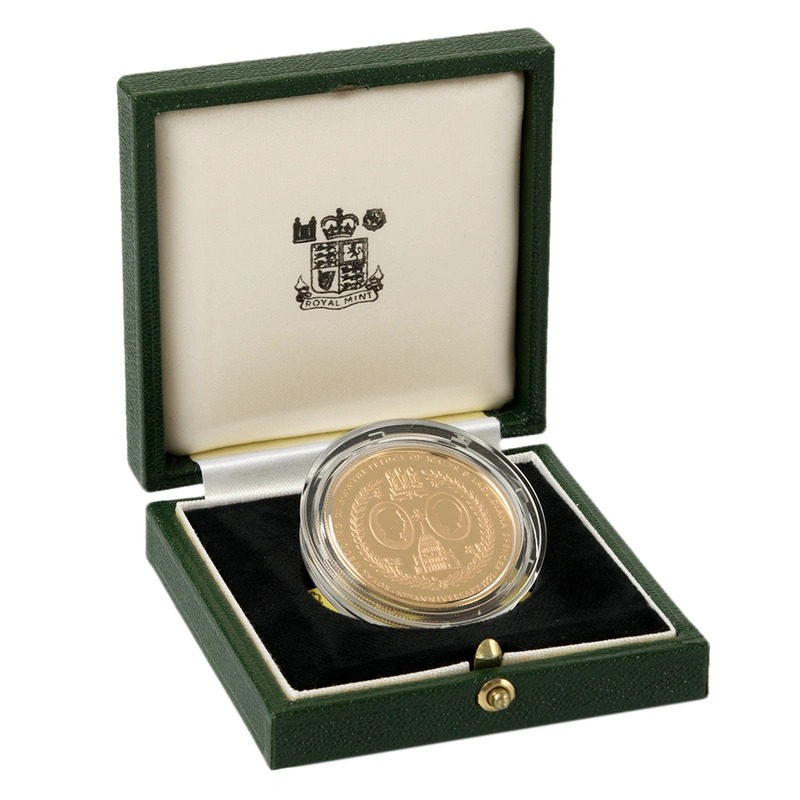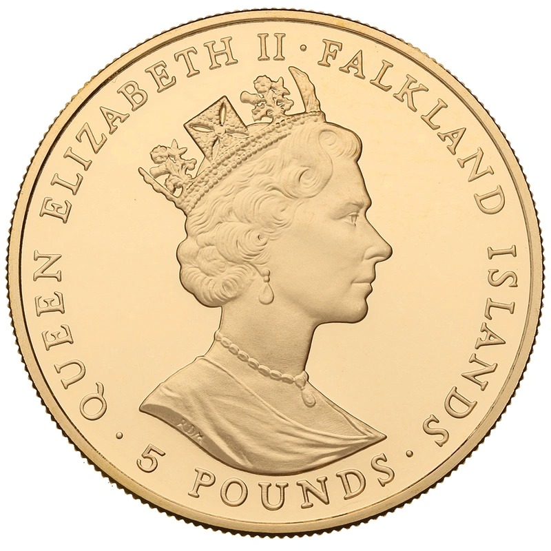 This gold proof £5 coin (aka Quintuple Sovereign, or gold Crown) was issued by the Royal Mint for the Falkland Islands to celebrate the 10th Wedding Anniversary of the Prince and Princess of Wales. It comes boxed with a certificate, and is one of only 200 sets issued.