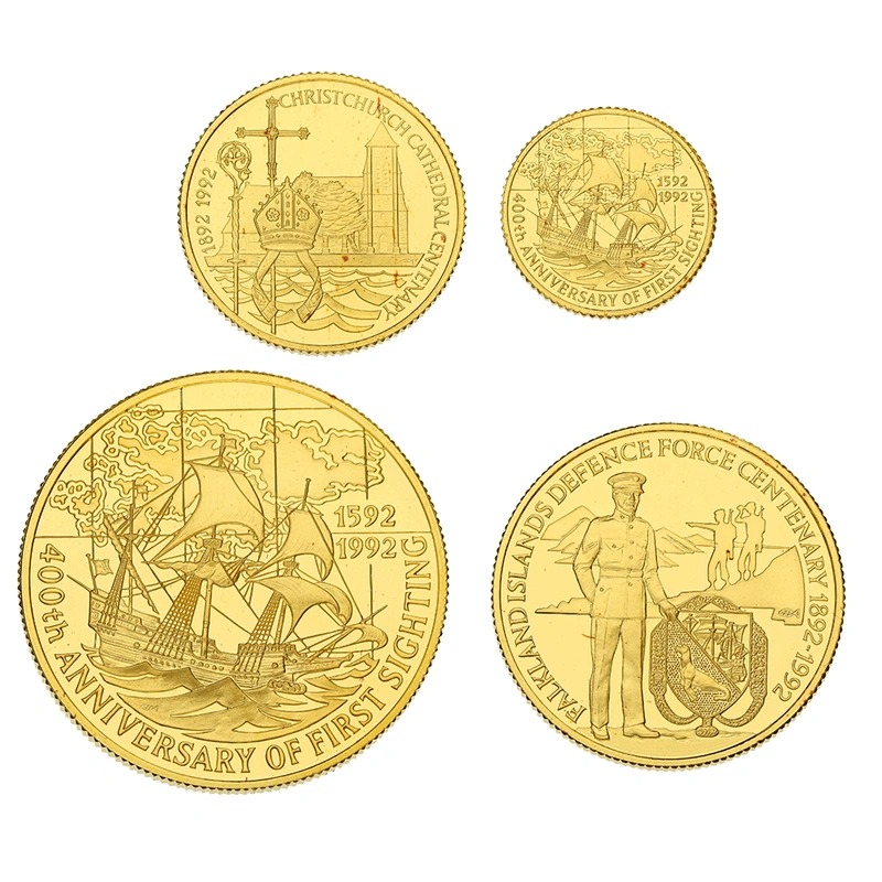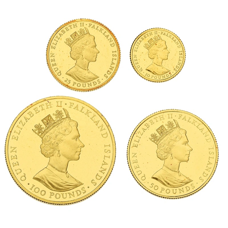 A four coin proof set issued by the Royal Mint for the Falkland Islands to commemorate a number of important Falklands anniversaries. Features 1oz, 1/2oz, 1/4oz, 1/10oz coins. Limited to 400 sets. Boxed with certificate.