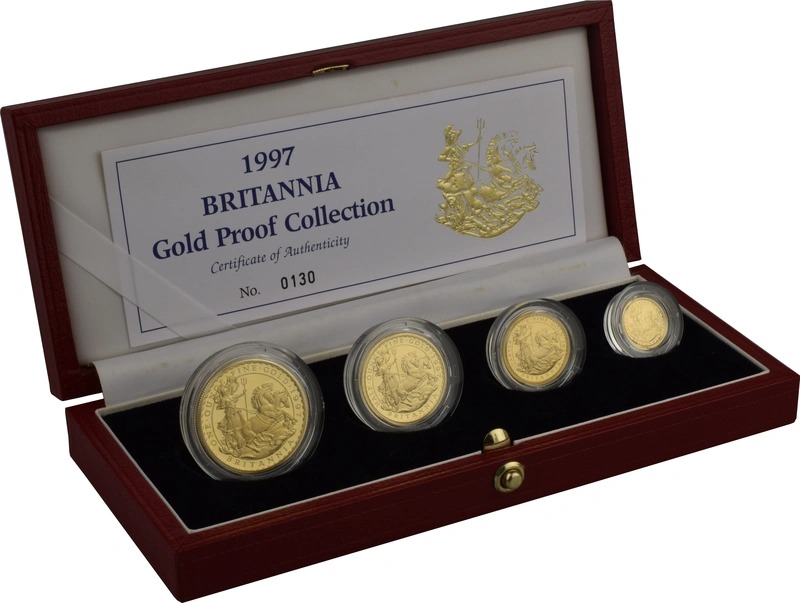 This stunning 1997 four gold coin Britannia Proof set is boxed with a certificate of authenticity. The face value £100 coin contains 1 ounce (31.104g) of fine gold, the £50 coin contains one half ounce (15.552g), the £25 coin contains one quarter ounce (7.776g) and finally the £10 coin contains one tenth ounce of gold (3.110g).