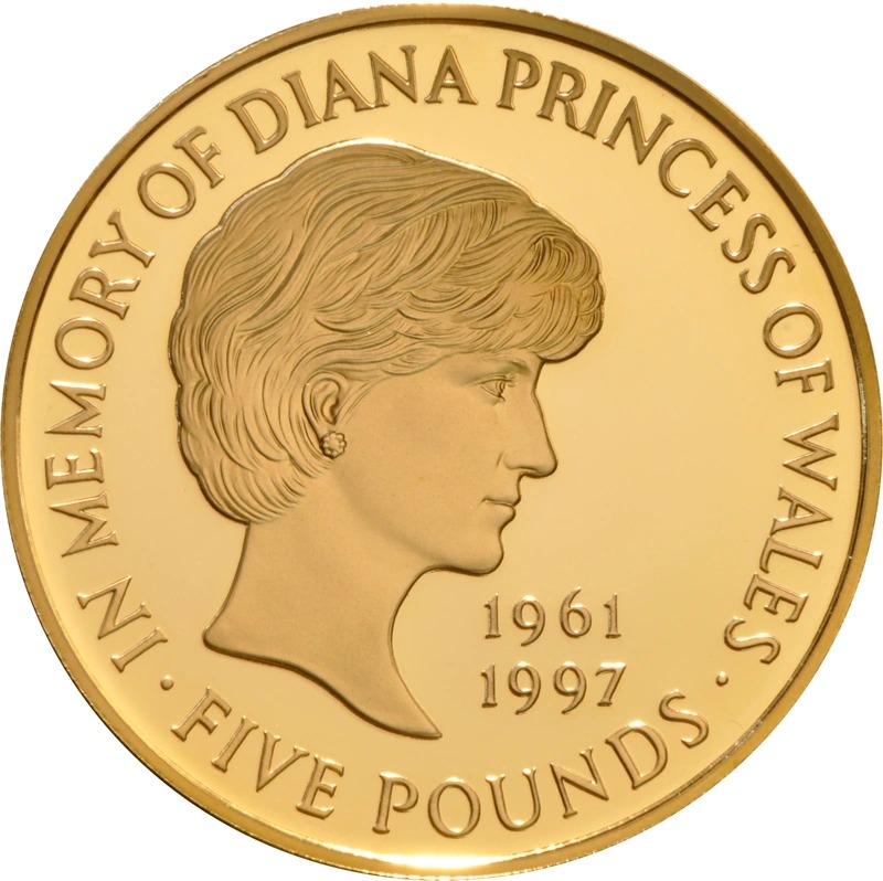 This 1999 Proof gold £5 coin (aka Quintuple Sovereign, or Crown) was issued in memory of Diana Princess of Wales 1961-1997.