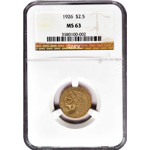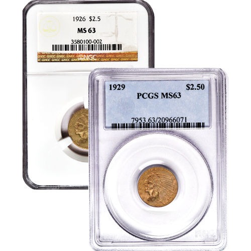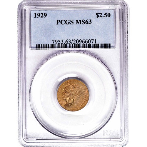 During the latter stages of the 19th century the US Mint received an inordinate amount of gold stemming from the California gold rush. Because of all this surplus gold, the US Mint decided that it was best to introduce a number of gold coins to the US economy. The $2.5 Indian Gold Quarter Eagle is one of those coins and is guaranteed to be in Mint State 63 condition as certified by the PCGS or NGC. These coins are roughly a century old but are just as relevant now as they were towards the end of the 19th century. These coins ship in their certified slabs and are guaranteed to be authentic.