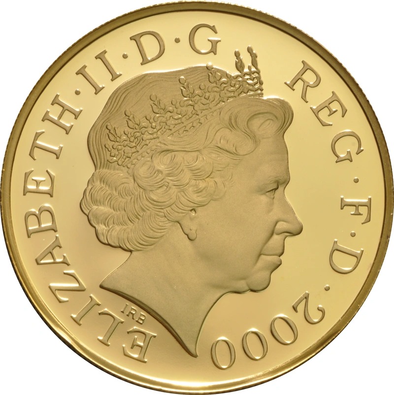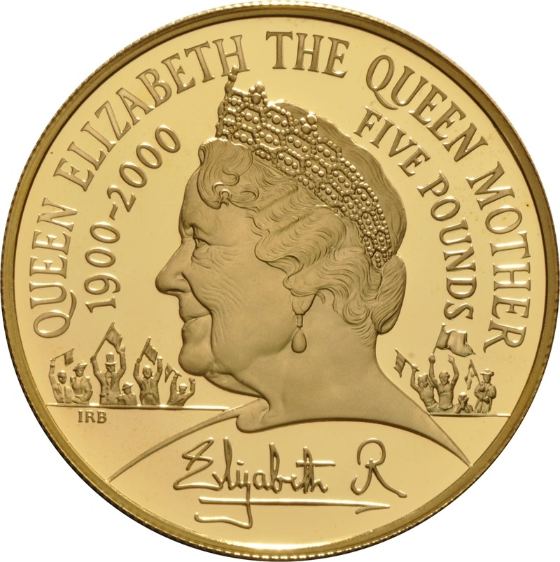 This Gold Proof £5 coin (aka Quintuple Sovereign, or Crown) was issued to celebrate the centenary year of the Queen Mother in 2000.