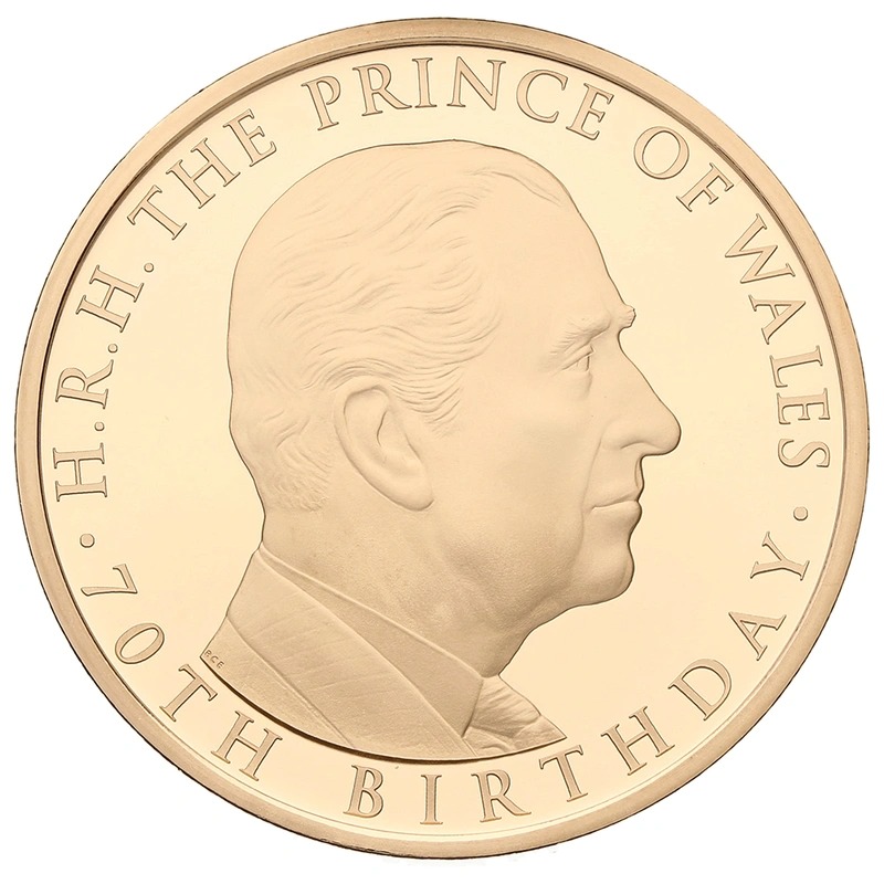 This proof gold £5 coin (aka Quintuple Sovereign, or gold Crown) was produced by the Royal Mint to celebrate Prince Charles‘ 70th Birthday.