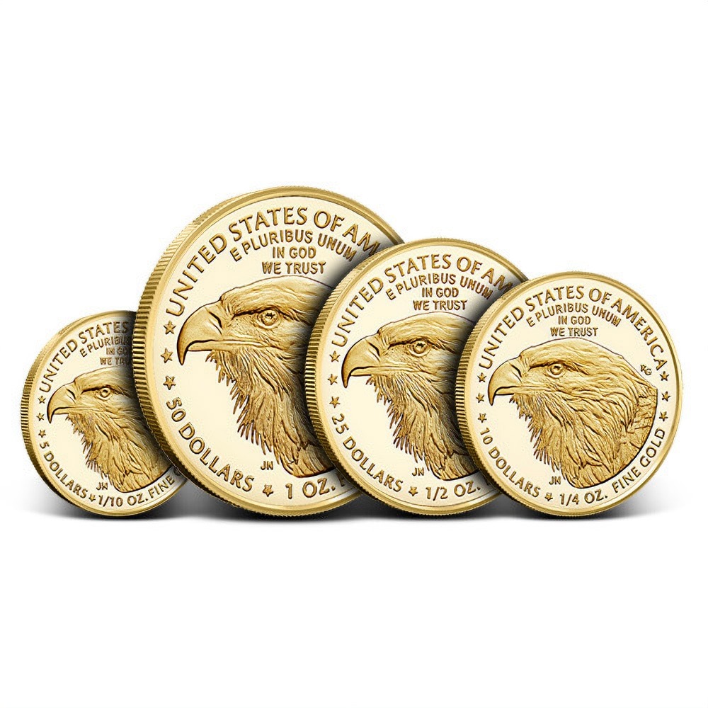 With the purchase of Proof American Gold Eagle 4-Coin Sets, collectors get one of each of the Proof Gold Eagles the US Mint strikes. Included within the set are the 1 oz, 1/2 oz, 1/4 oz, and 1/10 oz gold coins, each one with 22-karat gold content. In the American Gold Eagle Series, 22-karat gold content consists of 91.67% gold, 5.33% copper, and 3% silver. The coins have respective face values of $50, $25, $10, and $5 (USD).