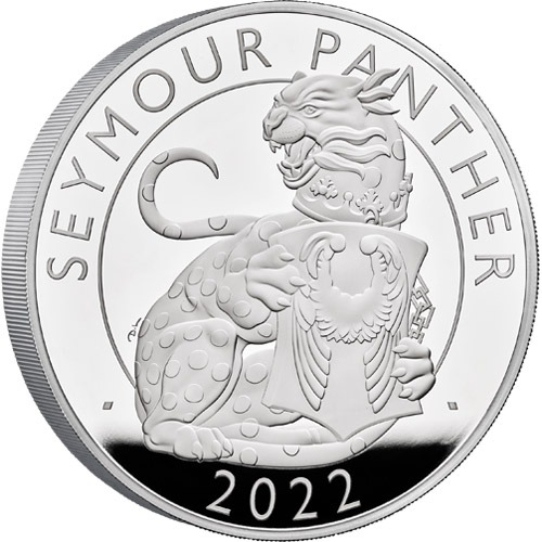 The Seymour Panther is found on the reverse of 2022 Proof British Silver Tudor Beasts Seymour Panther Coins. This design came to the Royal Court of King Henry VIII with his marriage to his third wife, Jane Seymour. The Seymour Panther is a spotted beast that often is depicted with flame coming from its ears and mouth. The panther supports a crest with the Seymour Wings, a set of wings joined together with the wingtips pointing downward.