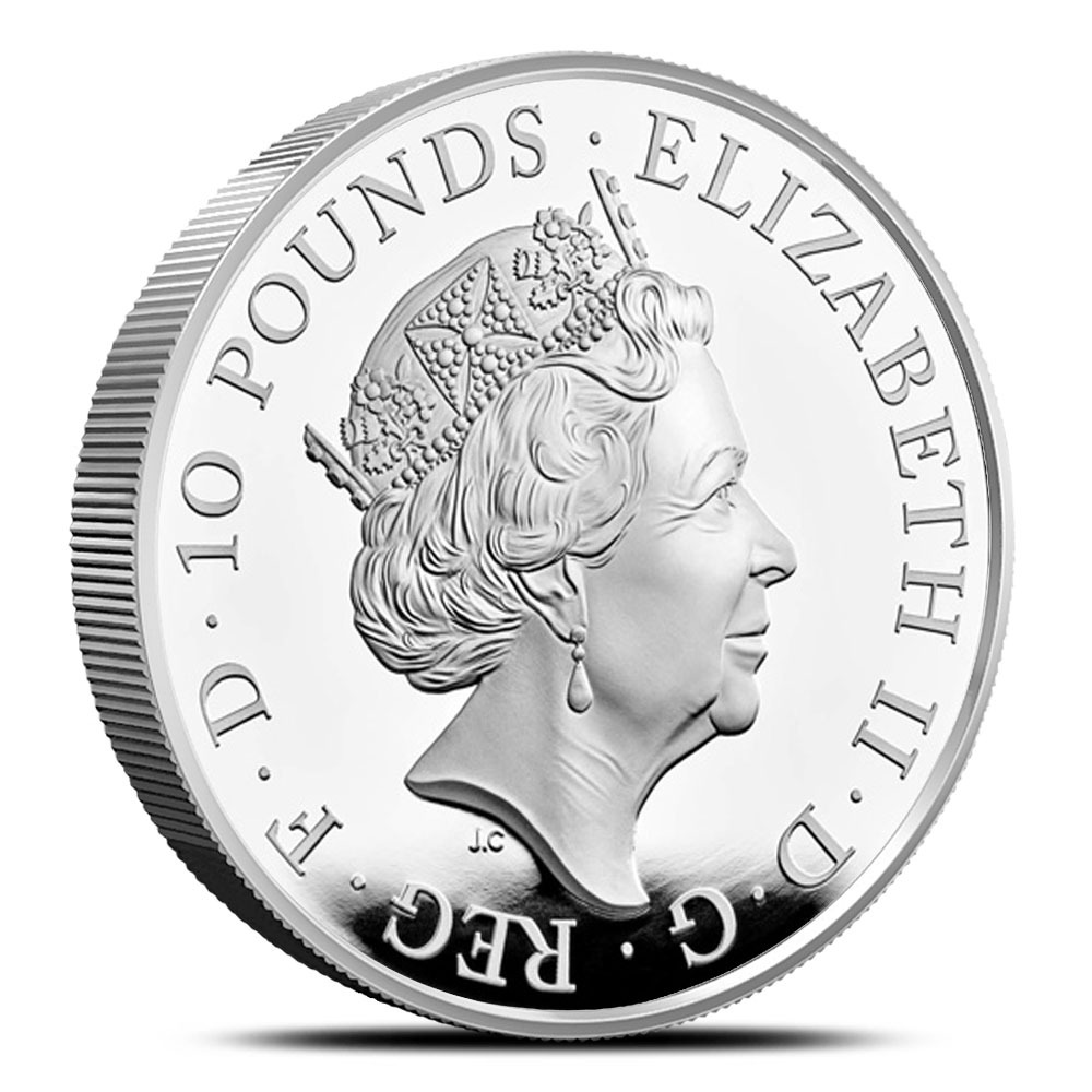 On the obverse of 2023 Proof British Silver Year of the Rabbit Coins, you’ll find a portrait of Queen Elizabeth II. This design was completed by Jody Clark for the Royal Mint in 2015. At the time he was only 33, making him the youngest engraver to ever have a portrait accepted for coinage by the mint. The obverse includes inscriptions along the rim reading Elizabeth II, D G REG F D, 10 Pounds.