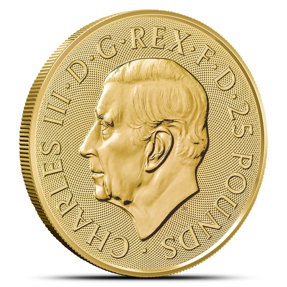 Displayed on the obverse of the 2025 British Gold The British Lions is a portrait of His Majesty King Charles III. This likeness, created by Martin Jennings in 2022, is the first official depiction of Charles III to appear on British currency, rendered in left-profile relief without the traditional crown.