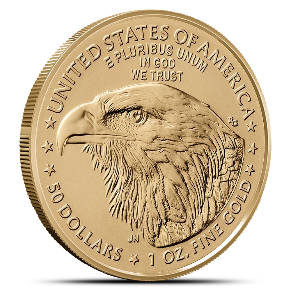 The reverse of 2025-W 1 oz Burnished Gold Eagle Coins comes with a modern depiction of the American bald eagle. This lifelike depiction of the eagle showcases the detailed physical features of its head in left-profile relief. Jennie Norris created this modern design in 2020, and it debuted in mid-2021.