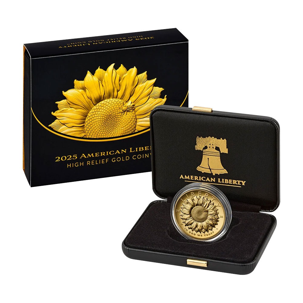 The American Liberty Series of gold coins and silver medals continues at the United States Mint in 2025, offering one of the most distinctive interpretations in the series to date. The 2025 release features a sunflower and honey bee on the obverse, with a 1 oz proof silver medal from the Philadelphia Mint and a 1 oz high–relief gold coin from the West Point Mint. Today, 2025–W 1 oz Proof American Liberty High Relief Gold Coins are available.