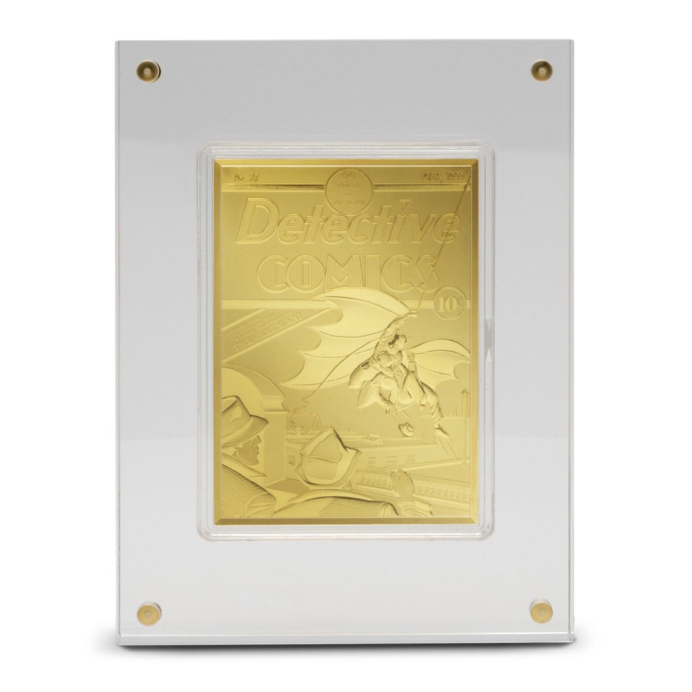 All 2025 5 oz Niue Silver 90 Years of DC Golden Era Detective Comics #27 Coins are available in DC-themed presentation boxes. The coins are housed in these Golden Era boxes celebrating the 90th anniversary of DC Comics. The coins are rectangular silver coins with a gilded layer of 24-karat gold.