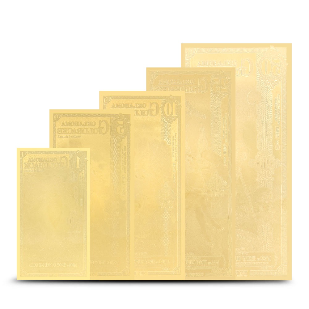 The Goldback Series expands in 2025 with Oklahoma becoming the latest state to issue these innovative gold currency notes. Goldbacks are designed to provide accessible investments in 24–karat gold while also celebrating the individual stories and traditions of each state. We now offers the full 5-piece Oklahoma Goldback Gold Note Set.