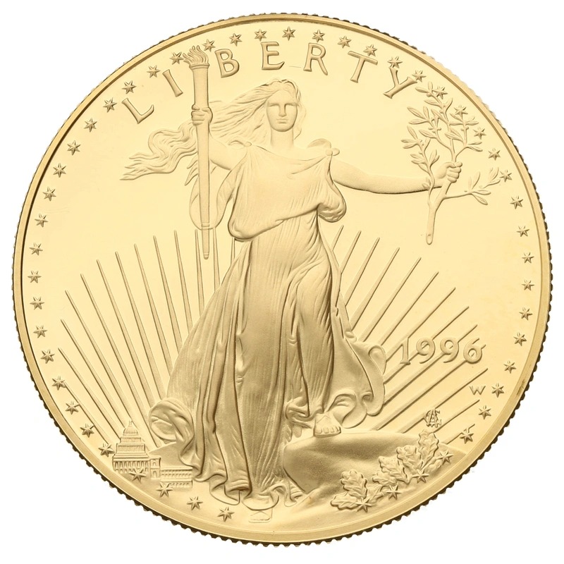 A 1996 gold proof American Eagle set that contains 4 proof coins weighing 1oz, 1/2oz, 1/4oz and 1/10oz struck in 22 carat gold and presented in its original box.