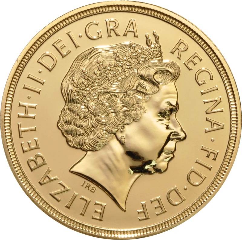 This gold proof £5 coin (aka Quintuple Sovereign, or Crown) was issued as a Brilliant Uncirculated coin.