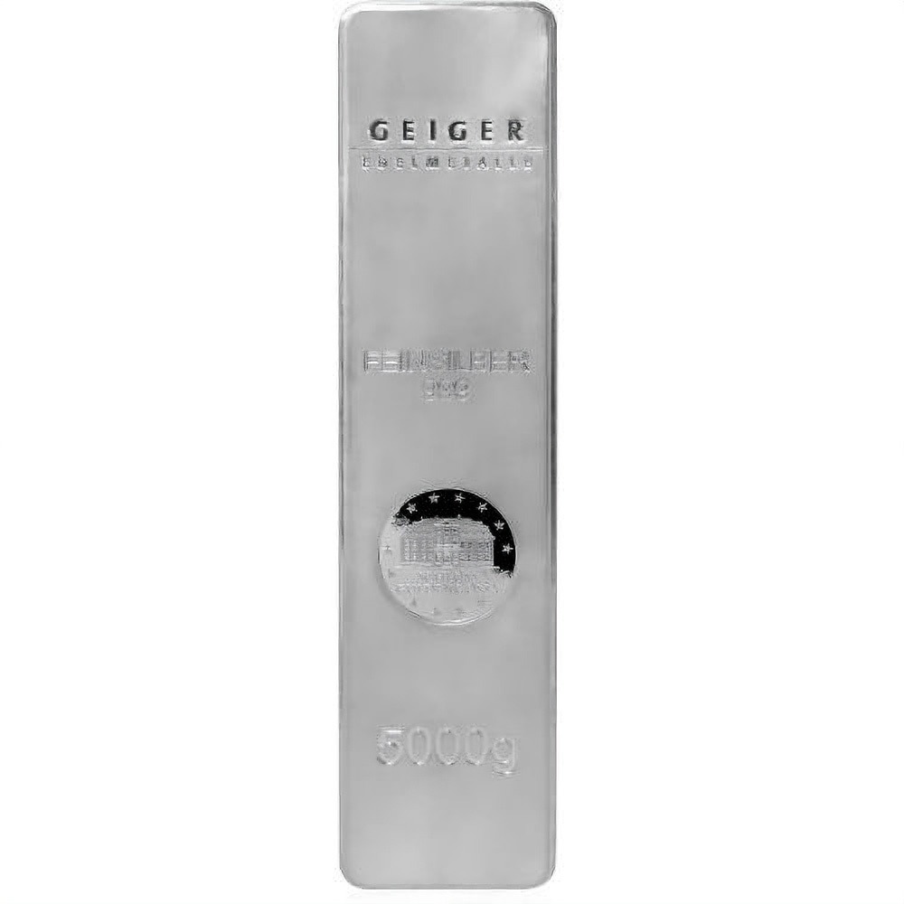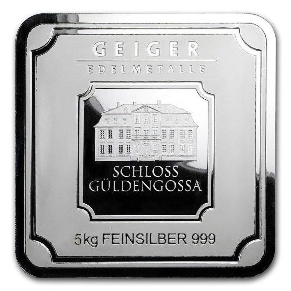 Obverse and reverse design elements on these 5000 Gram Silver Bars will vary based on the specific bar that you receive. One example of a 5000 Gram Silver Bar you could receive through this listing is the 5000 Gram Geiger Square Silver Bars. These items come from a new series at Geiger Edelmetalle that integrates enhanced security features in the design of the bars.