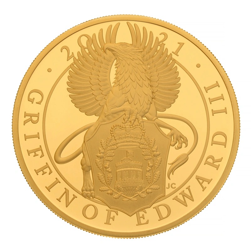 A stunning 2021 Proof 5oz Griffin of Edward III gold coin from the Queen’s Beasts series. Supplied in the original box with certificate.