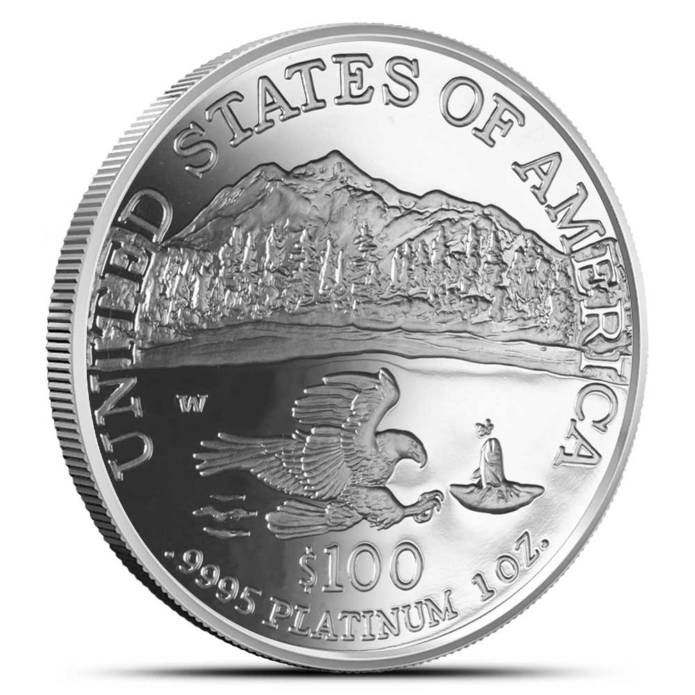 On the reverse side of 2002 Proof Platinum Eagle Coins, you will find the image of an American bald eagle swooping toward a lake to capture a trout splashing from the surface. The design includes a lake encircled by snowcapped mountains and reflects the visuals of the Northwestern United States.