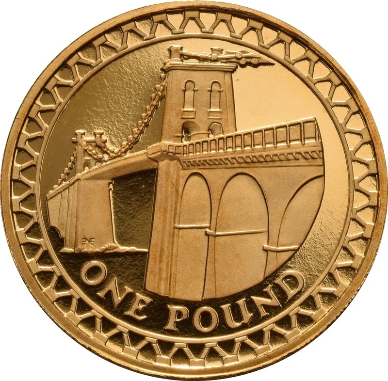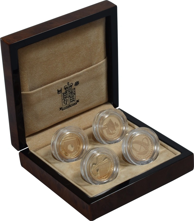 The Gold Proof 2004-2007 Four-Coin One-Pound Collection boxed with certificates. This set contains four gold £1 coins, featuring bridges of the UK, which at the time, were all forerunners to a new series of designs for the £1 coin. The four featured bridges are the Forth bridge, the Telford bridge, the Egyptian bridge and the Millennium bridge.