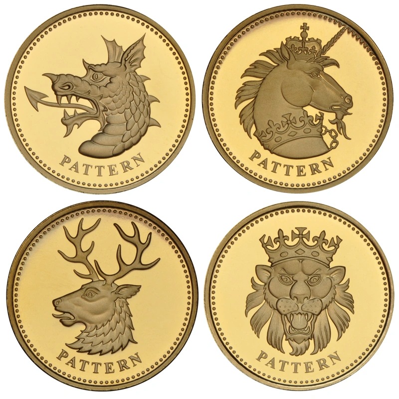 The Gold Proof 2004 Four-Coin One-Pound Pattern Collection. This set contains four gold £1 coins, featuring the Scottish Unicorn, Welsh Dragon, Northern Ireland White Hart and English Lion by T. Noad.