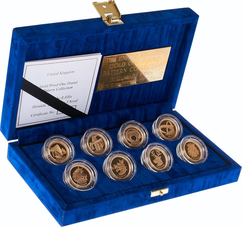 These proof £1 gold coins have a plain edge, (so to continue the custom of striking plain-edged specimens for coin collectors) apart from a hallmark which guarantees their status as Royal Mint patterns. The obverse of these gold £1 coins contain the inscription ‘PATTERN’ where they would normally have the words “ONE POUND”. Boxed with certificate.